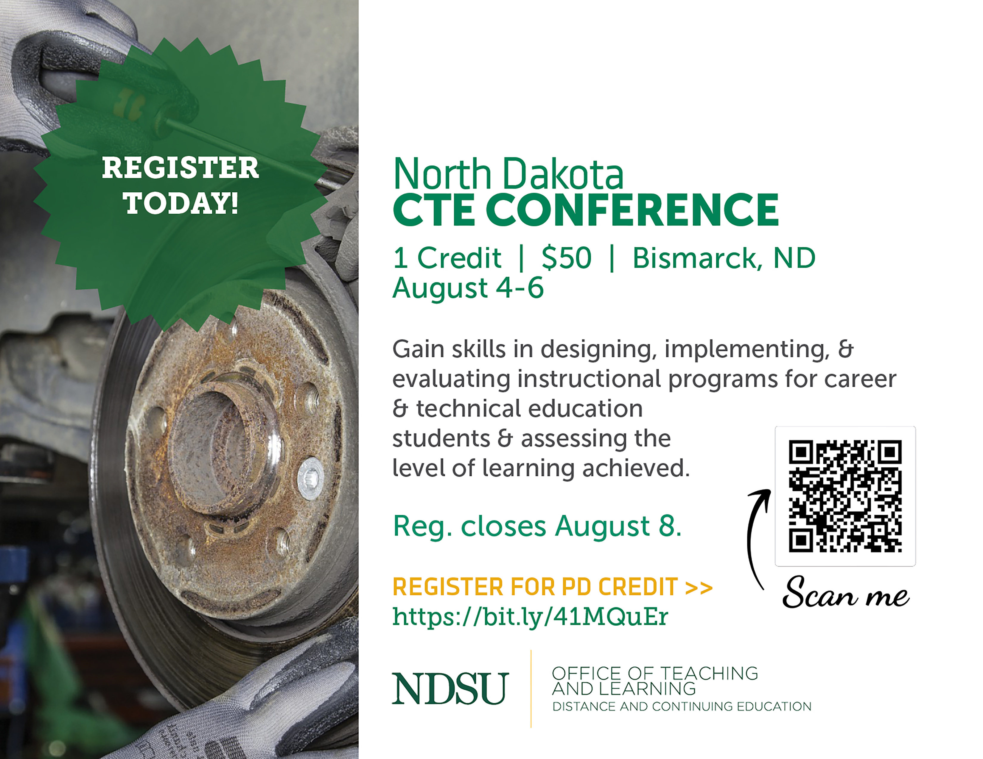 This event requires pre-registration, to register please go to https://www.cte.nd.gov/pdc. Event Registration Fees (Payable to ND CTE). The assignment for this credit will also be found on the Registration link at the end of the conference.